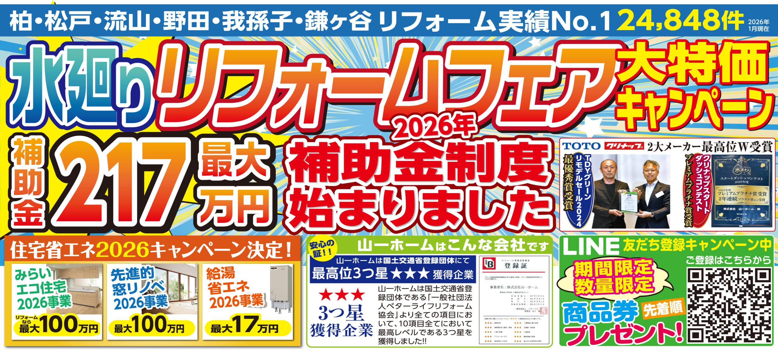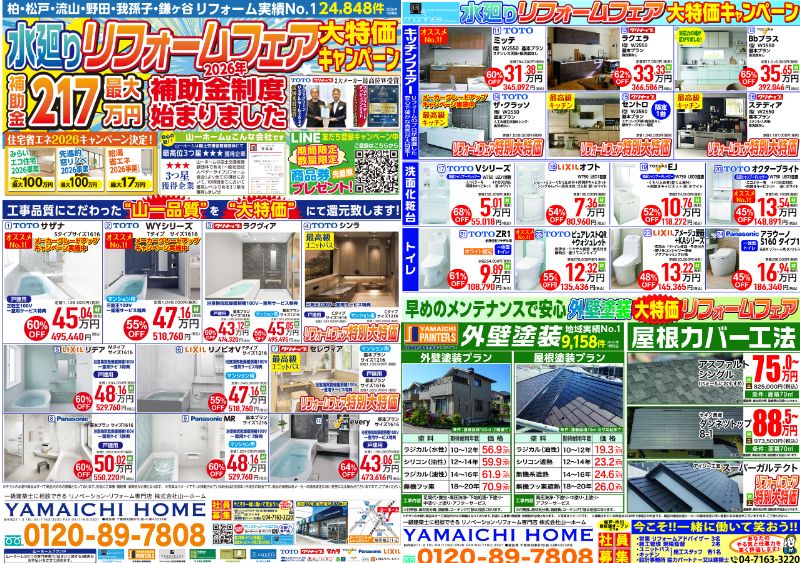 山一ホーム 水廻り専門店”マリンズ”・”水廻りリフォームフェア大特価キャンペーン”及び外壁塗装・屋根事業部”ペインターズ”主催外壁塗装 大特価リフォームフェア”を同時開催いたします!!