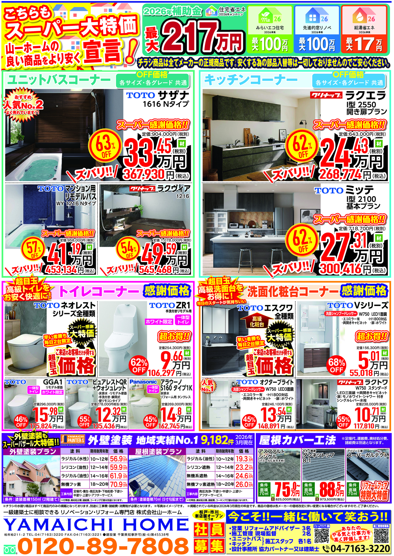 外壁・屋根リフォームをお考えの皆様には、リフォームシーズン到来です。塗料の品質にこだわった、オススメプランを【スーパーバザール大特価格】にて、ご提案致します。