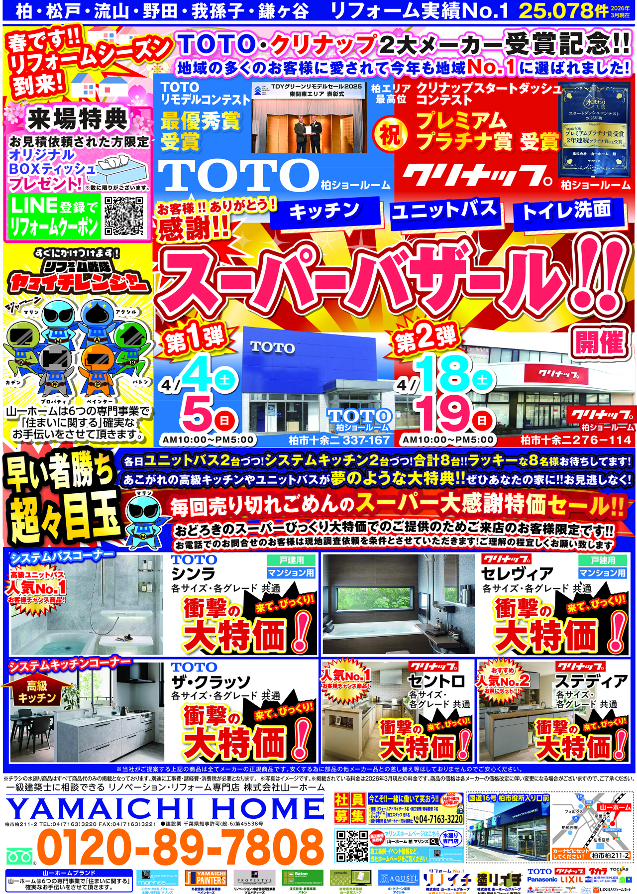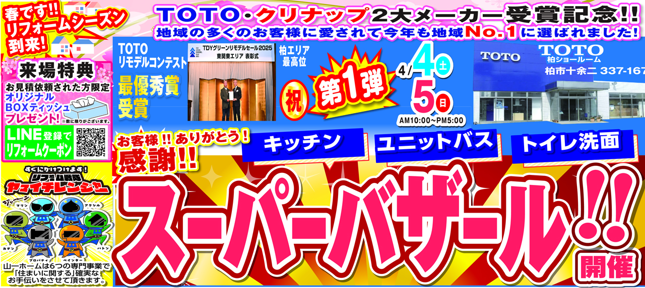1弾として、TOTO柏ショールームにて、44(土)・5(日)に、水廻り専門店:マリンズ主催『スーパーバザール‼』及び外壁塗装・屋根事業部:ペインターズ主催『外壁塗装スーパーバザール‼』を同時開催いたします!!